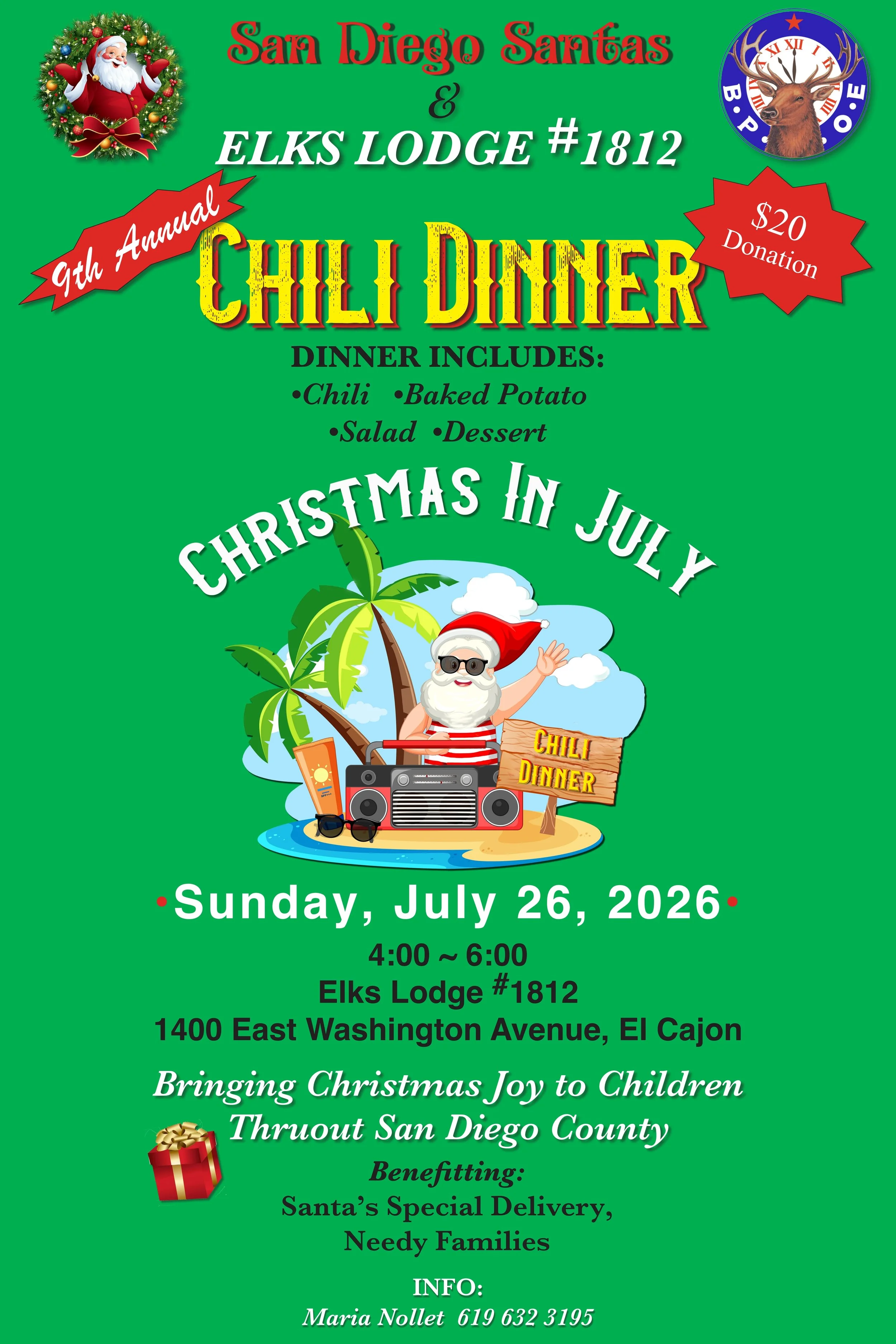 Our 9th annual Chili Dinner Fundraiser will be on Sunday, July 26 at the Elks Lodge in El Cajon. This is how we raise funds for “Santa’s Special Delivery” which benefits the families identified by Breast Cancer Angels, and others who are known to be in need. Please consider donating to this worthy cause!
